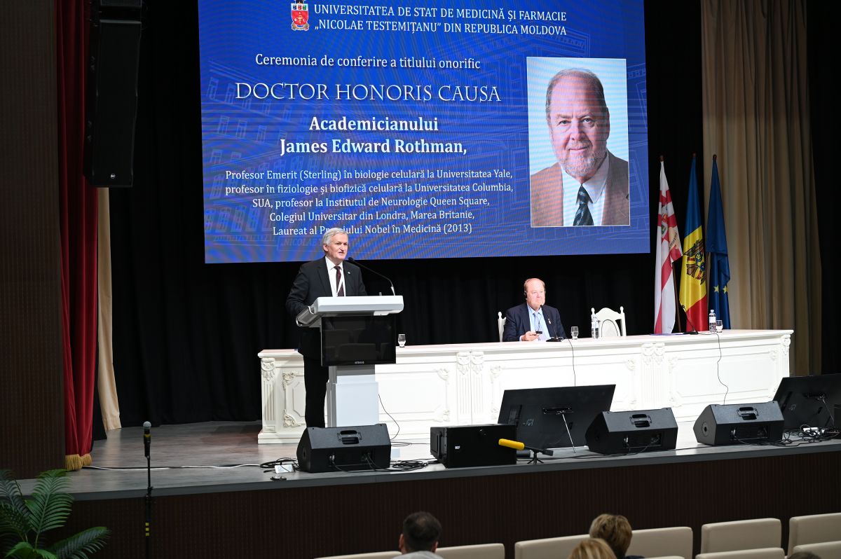 Nicolae Testemitanu State University of Medicine and Pharmacy of the Republic of Moldova conferred the honorary title Doctor Honoris Causa on Academician James Edward Rothman - a remarkable personality in the field of modern biology, Sterling Professor in Cell Biology at Yale University, Professor of Cellular Physiology and Biophysics at Columbia University, USA, Professor at the Queen Square Institute of Neurology, University College London, UK, Nobel Prize Laureate in Medicine (2013).